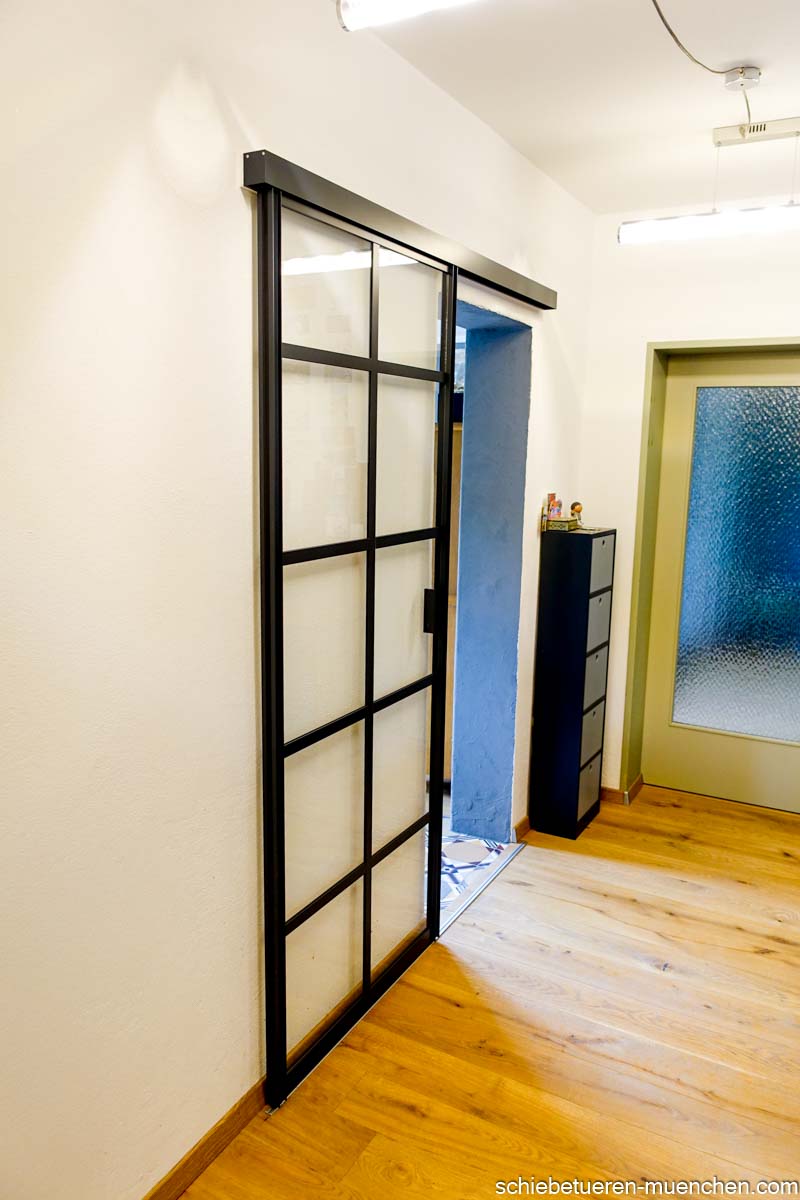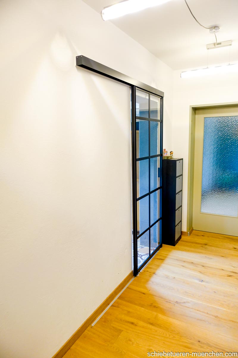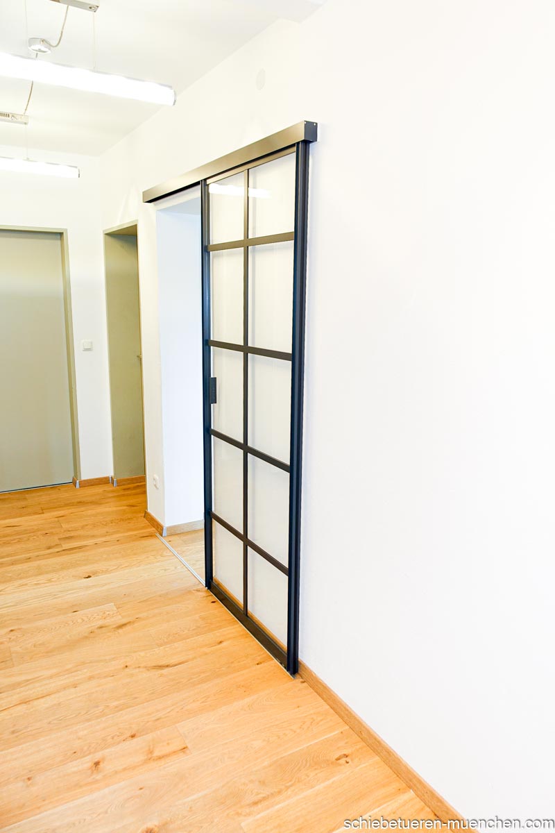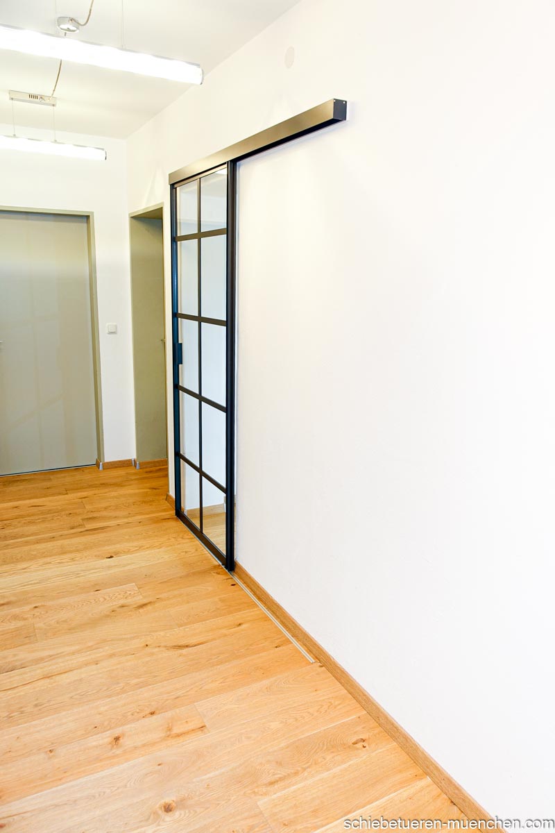 Schwarze Loft-Schiebetür mit Sprossen – Wandmontage, 1-flügelig, Klarglas