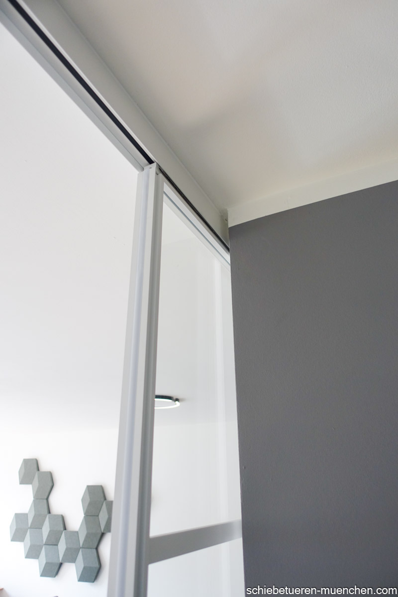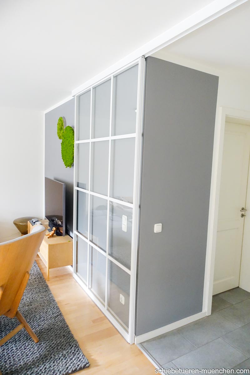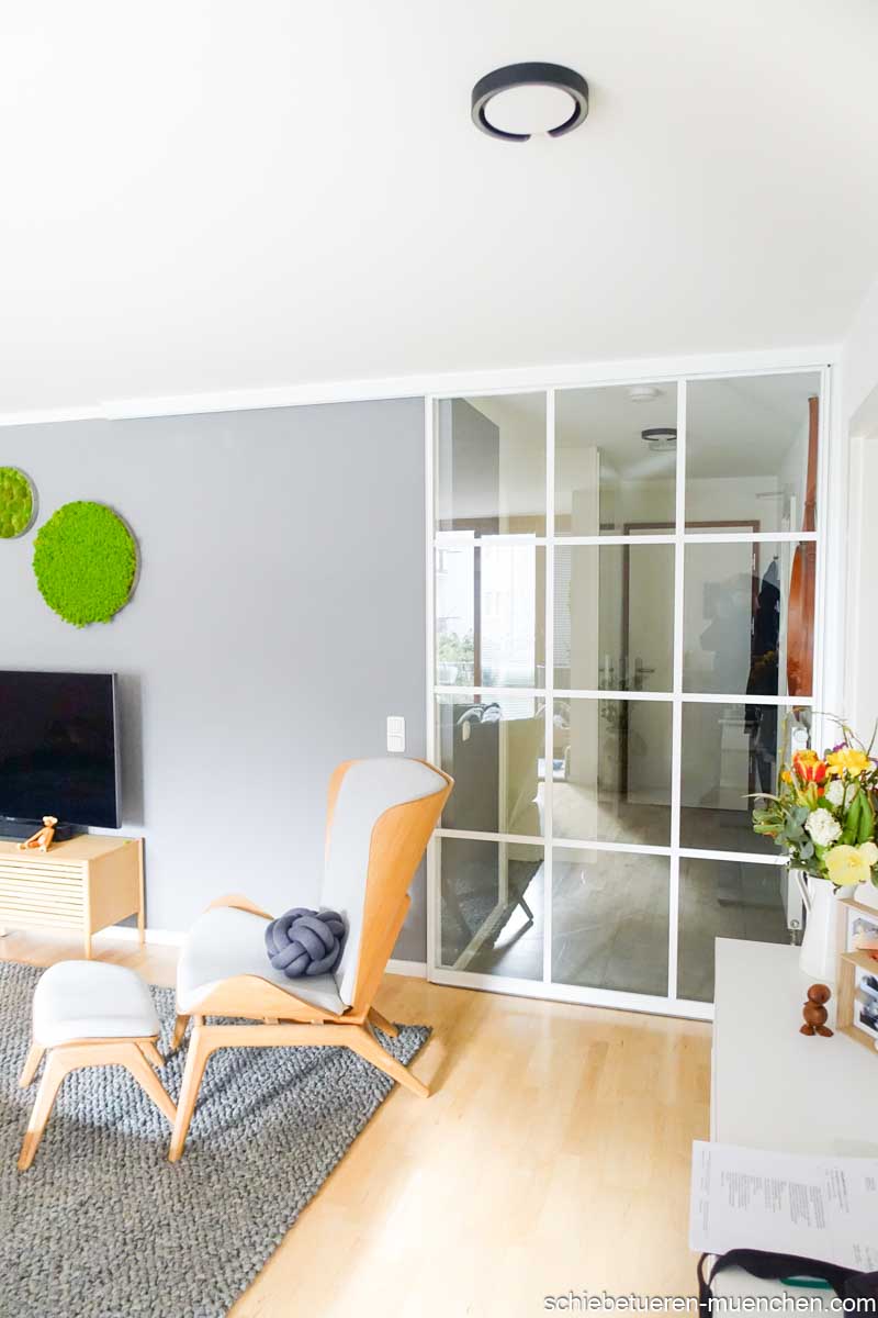 Loft-Schiebetür als Raumteiler – 1-flügelig, hängend, Weiß mit Klarglas & Sprossen