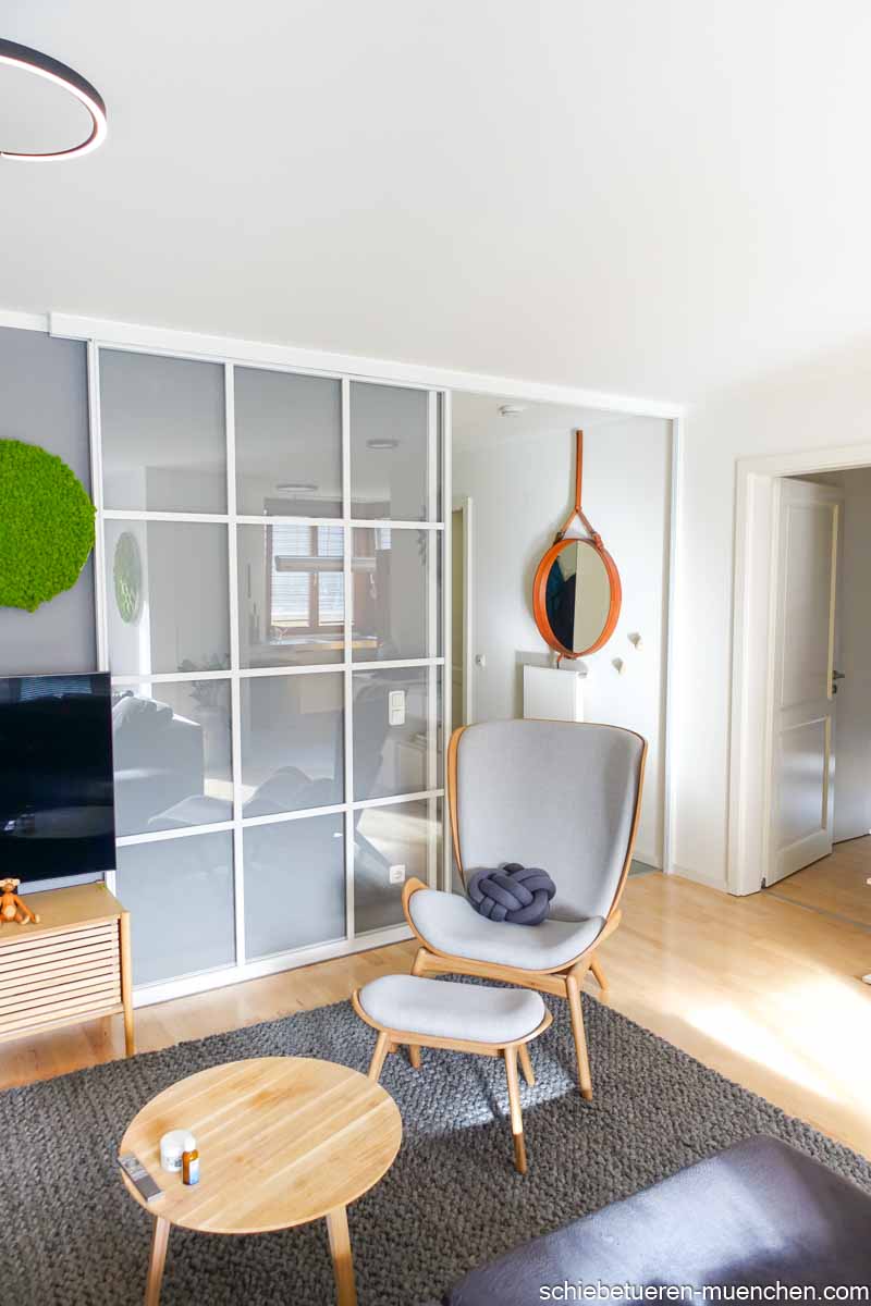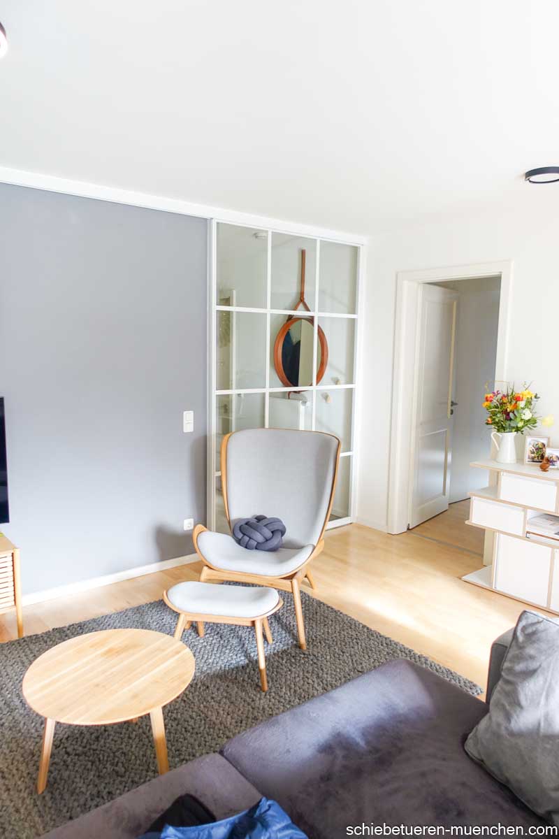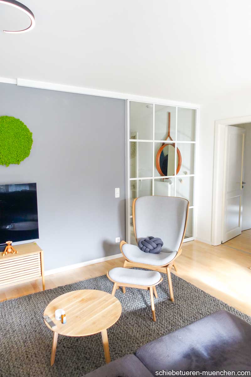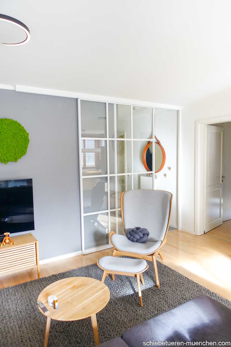 Loft-Schiebetür als Raumteiler – 1-flügelig, hängend, Weiß mit Klarglas & Sprossen